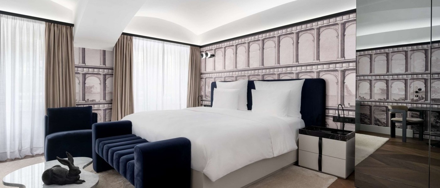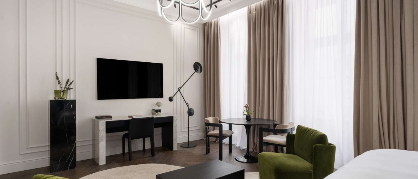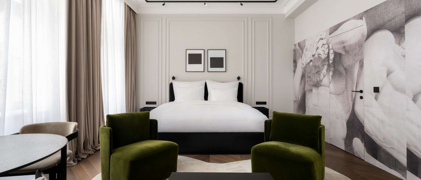 Hotel raspolaže sa 62 luksuzno uređene sobe i apartmana, svaki pažljivo dizajniran da pruži osjećaj intimnog komfora i stila. Interijeri kombiniraju klasične arhitektonske elemente s umjetničkim detaljima, kreirajući atmosferu koja priziva bečku eleganciju, ali u suvremenom ruhu.