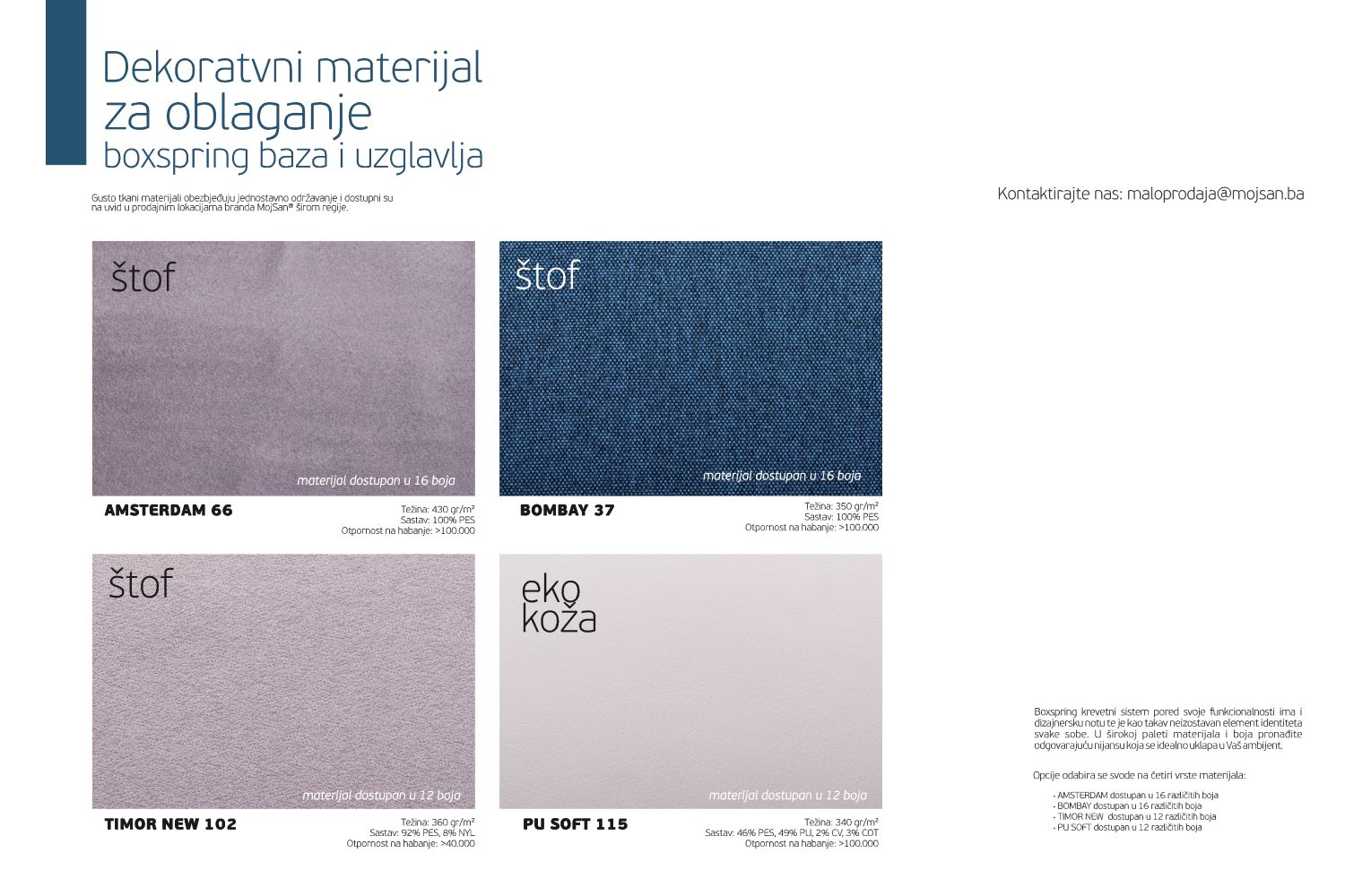 Odabir vrste materijala i 56 različitih boja prema kojima možete stilizirati Vaše BoxSpring krevetne sisteme MojSan je omogućen kroz štof opcije Amsterdam, Bombay i Timor New te opcije eko kože PU SOFT.