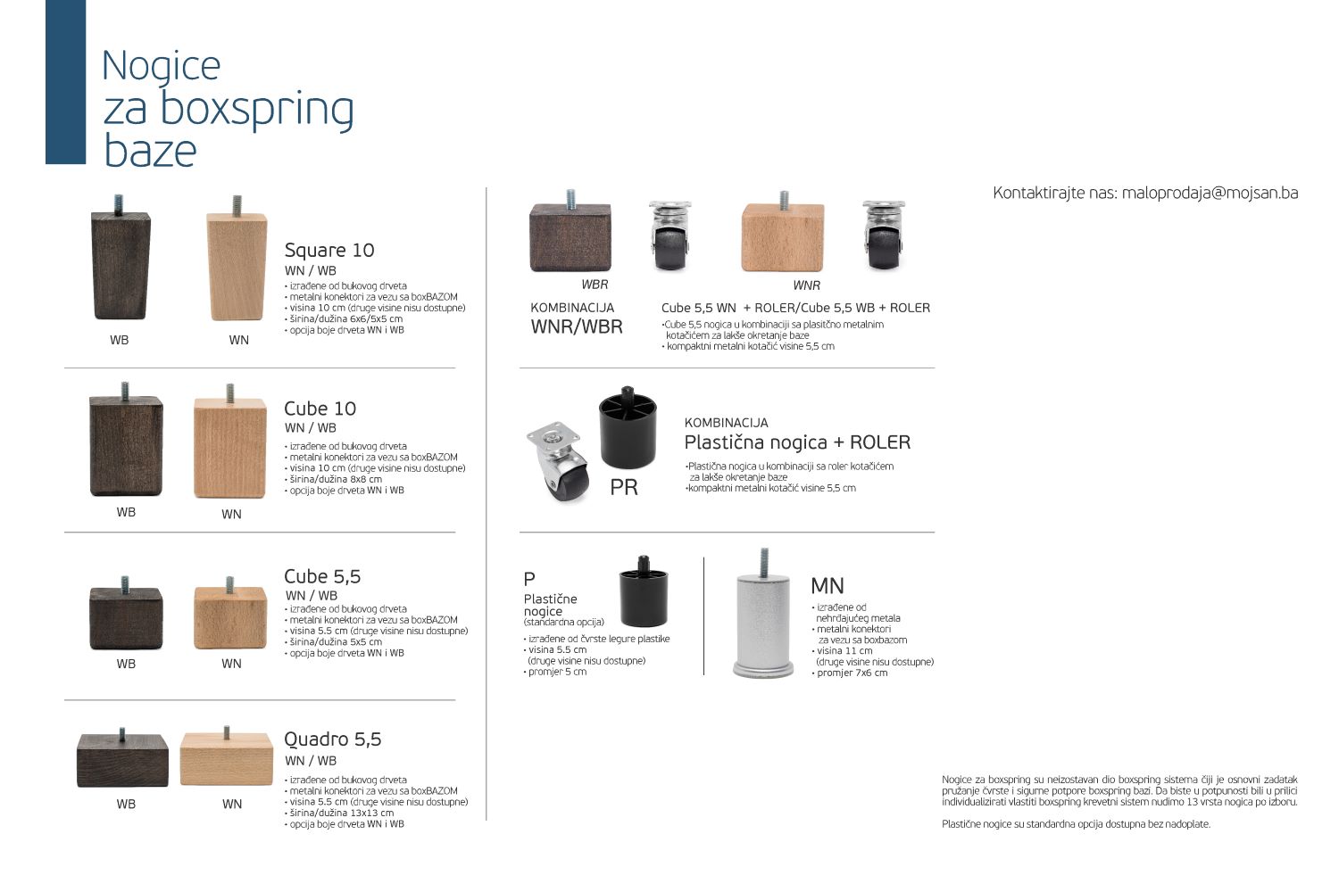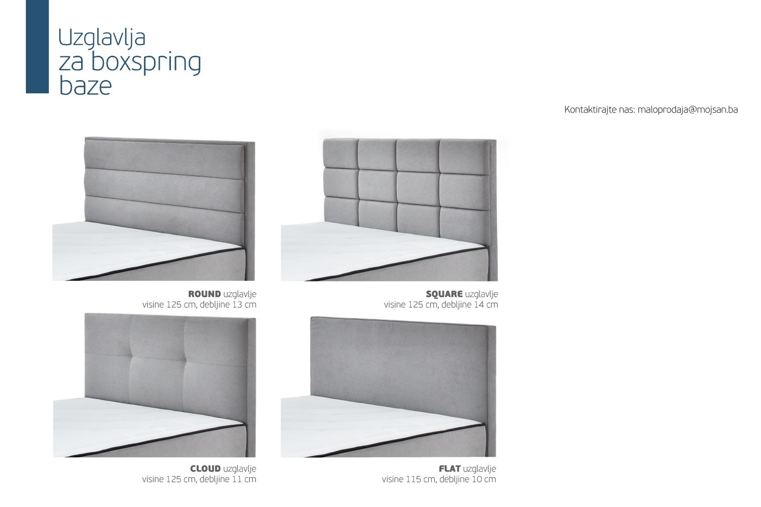 Boxspring krevetni sistemi su postali dio vizualnog identiteta kako hotelskih tako i spavaćih soba u mnogim domaćinstvima. Sistem se sastoji od baze kao osnovnog elementa, uzglavlja te nogica. Svaki od elemenata ima više varijacija te je moguće kombiniranjem tih opcija individualizirati vlastiti boxspring krevetni sistem. Boxspring krevetni sistemi MojSan imaju za cilj da uštede dragocjeni prostor sobe, omoguće jednostavno održavanje prostora, osiguraju maksimalnu potporu madracu i značajno utiču na ukupni dojam udobnosti. Praktičnost se ogleda u mogućnosti sklapanja dva single kreveta u jedan gdje jednostavno radite transformaciju od sobe za partnere do sobe sa dva odvojena ležaja.